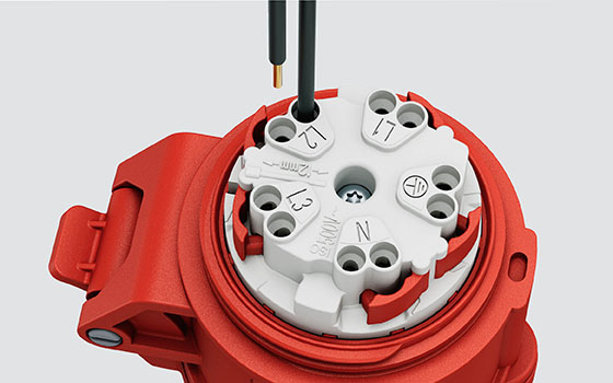 De wand- en inbouwcontactdozen van MENNEKES in 16 en 32 A, zijn verkrijgbaar met de bijzonder tijdbesparende schroefloze veerklemtechniek TwinCONTACT. Hier isoleert u de geleider en leidt u deze zonder gereedschap in de contactdoos. Gecodeerde dubbele klemmen zorgen voor de juiste en vaste aansluiting van de geleider. Wanneer u een geleider weer wilt losmaken, drukt u op de rode vrijgavetoets – en vervolgens kunt u de geleider dan eenvoudig eruit trekken.